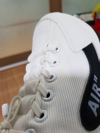 담점: 밑창 디자인이 오래가지 않을 것 같음, 긁힌 자국과 얼룩이 눈에 띔, 신발끈의 얼룩이 발에 딱 맞춰 끈을 땡기면서 나타날 수 있음, 얼룩과 긁힌 자국이 생길 것으로 예상