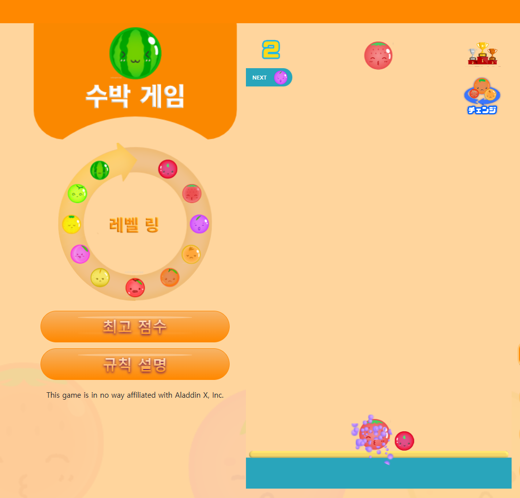 그 다음은 같은 방법으로 떨어뜨려주면 과일이 커지고 터지면서 점수를 얻을 수 있습니다.