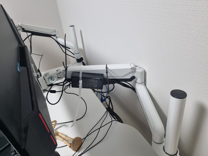 하지만 이 제품의 단점은 모니터 암의 상하 각도 조절 기능을 사용할 수 없을 정도로 강하게 조여야 한다는 것입니다. 또한 철제 부분의 도장 품질이 좋지 않아 데스크 테리어 용도로는 적합하지 않습니다. 브라켓류의 표면 상태도 불량한 부분이 있습니다.