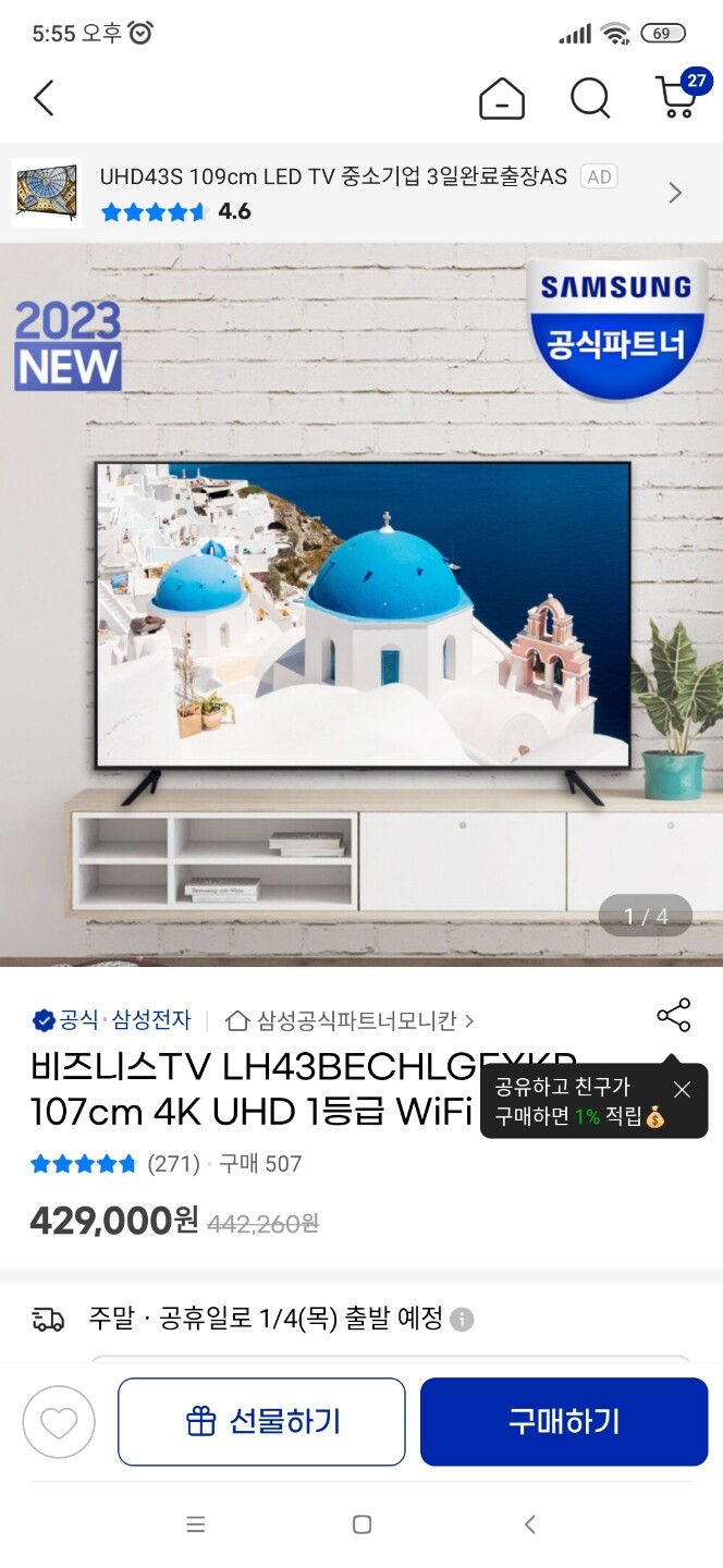 [제품 리뷰] 삼성전자 LH43BECHLGFXKR (스탠드) 상품 리뷰