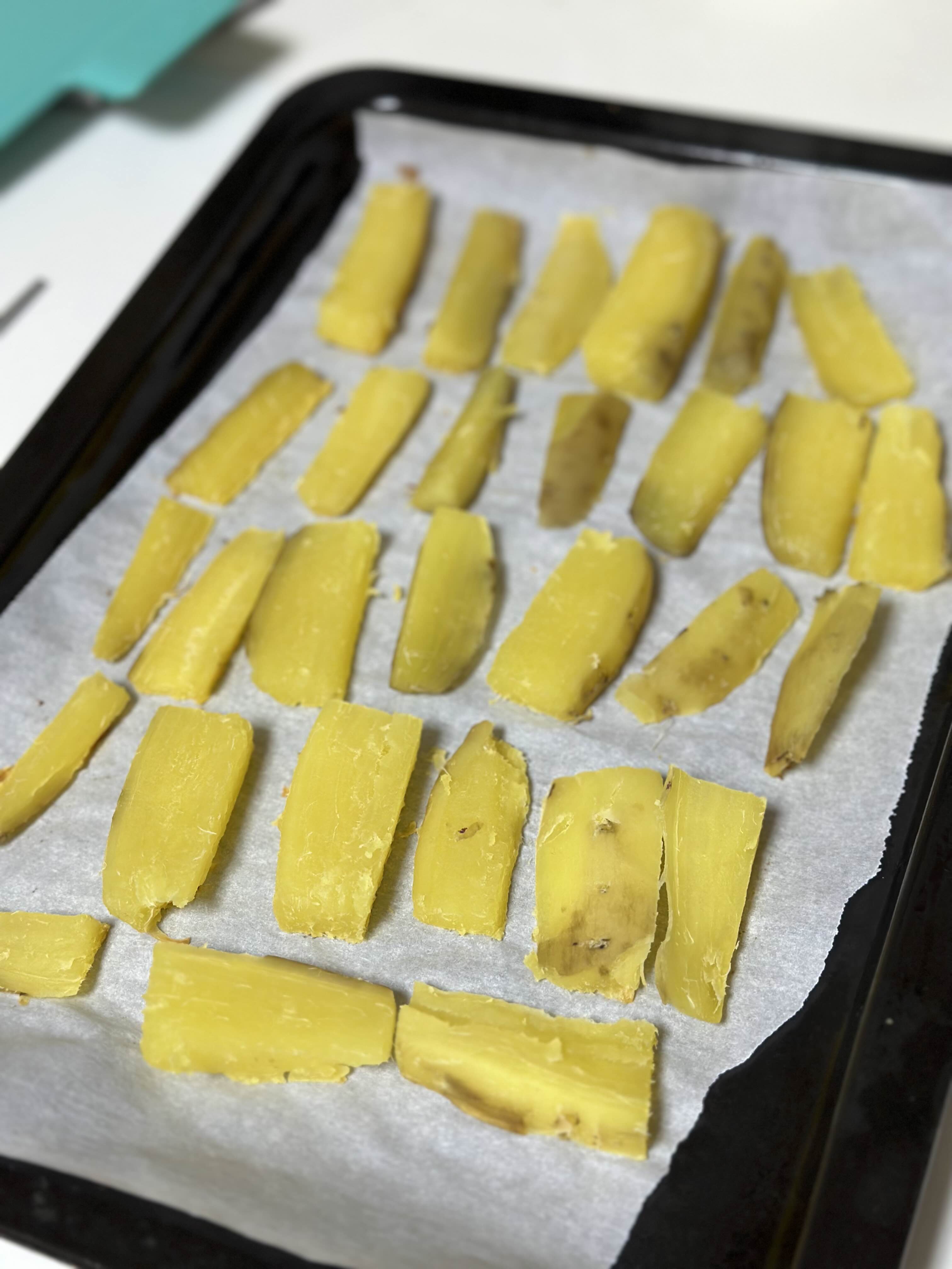 벗긴 고구마를 먹기 좋은 크기로 토막내어 오븐 용기에 담아줍니다. 바닥에 늘러붙지않게 종이호일은 필수에요.