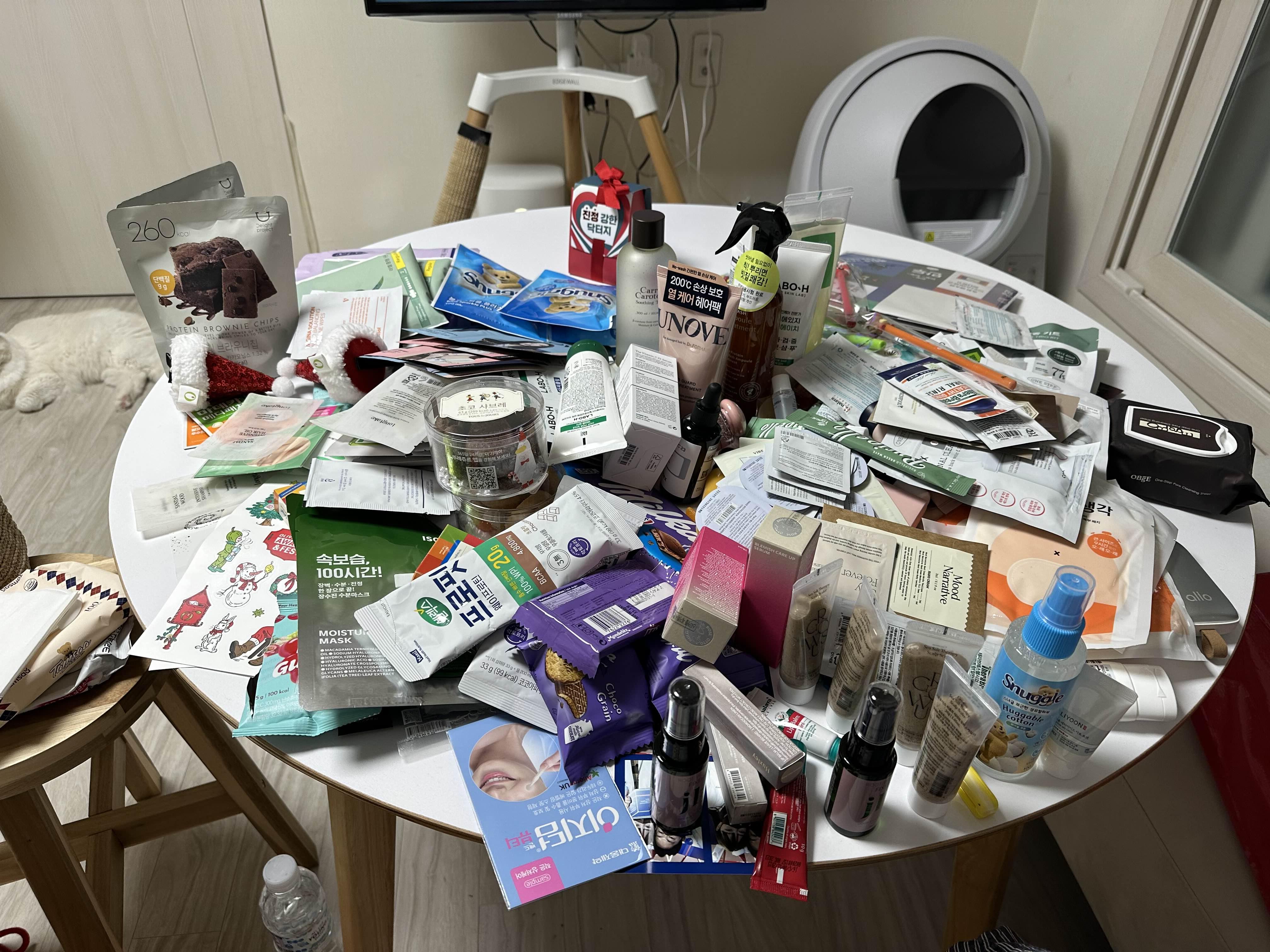 받아온 경품들을 포장지 다뜯어서 분류작업을 하는 중에 사진을 찍어 봤어요. 정말 많지 않아요?