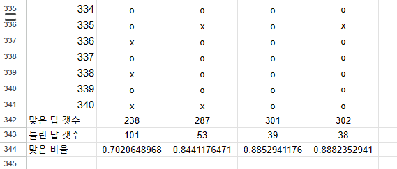 첫회에 비해 풀수록 맞는 비율이 많아졌지만,