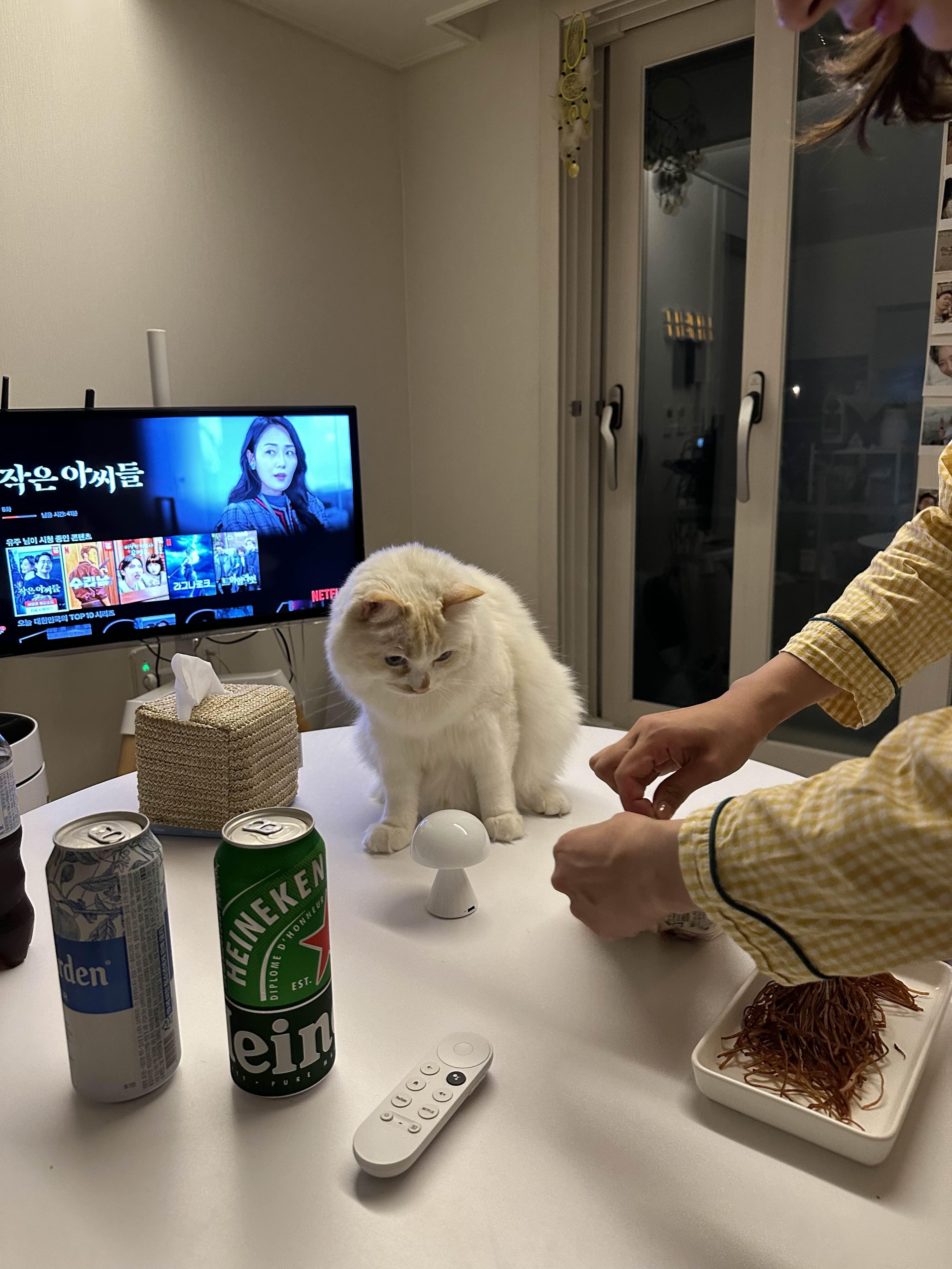 간이 안된 먹태는 가끔 주지만, 그 밖에 음식은 간이 되어서 주지 못하고 간식을 건내준답니다.