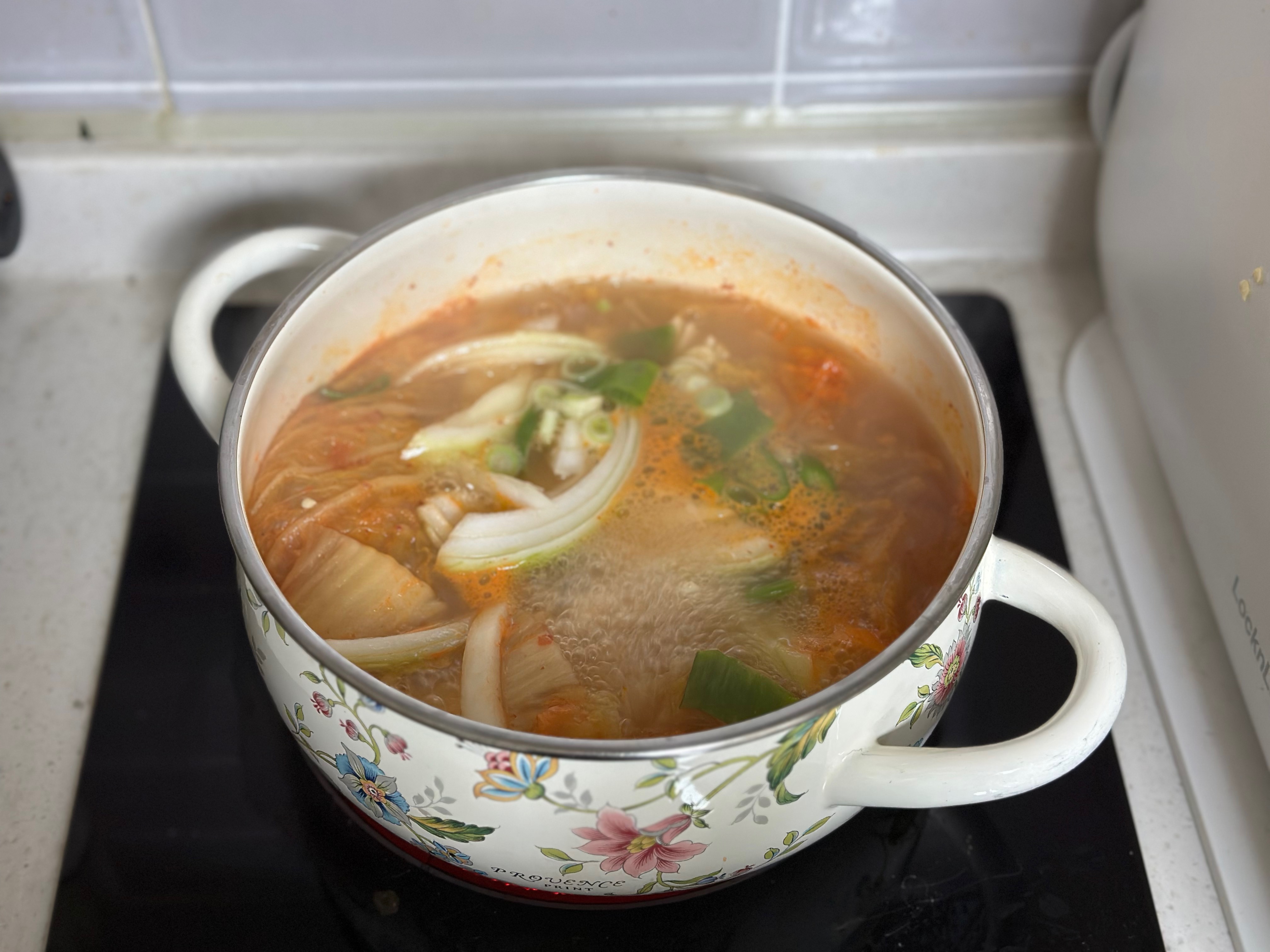 그 다음 우동이 끓을 때 쯤 야채와 묵은 김치를 넣고 팔팔 끓여줘요.